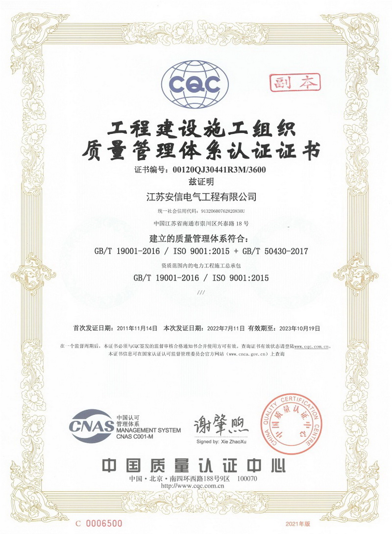 在創業之初,公司就堅持高起點的戰略思路,廣納賢才,集聚行業精英,創新發展,做優企業品牌?,F已取得:承裝二級、承修二級、承試二級,電力工程施工總承包二級,輸變電工程專業承包二級,建筑工程施工總承包二級,建筑機電安裝專業承包二級,地基基礎專業承包二級資質證書,并通過了質量、環境、職業健康和安全管理體系認證,確保各項工作有序管控。